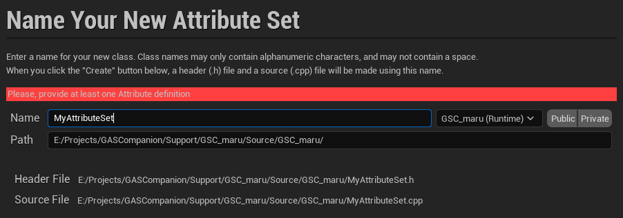 Define here the name for your new AttributeSet class, and its location. You can choose in which C++ module you want it to be generated (eg. all the local C++ module for your game and plugins, when in doubt use the default value which is your main game module).