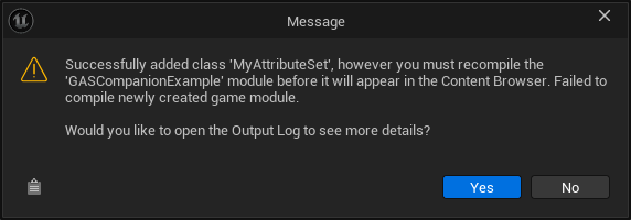 If the compilation goes fine, the engine will hot reload your project and you'll be able to use your new Attributes right away.
