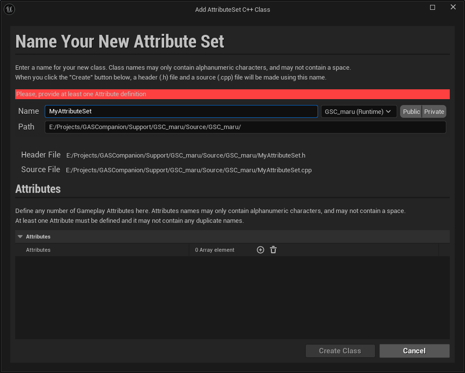 It works the same way as the standard Editor New C++ Class... action from File Menu or Content Browser, except it is customized to generate a valid AttributeSet with the Gameplay Attributes you can configure through the Class creation dialog.